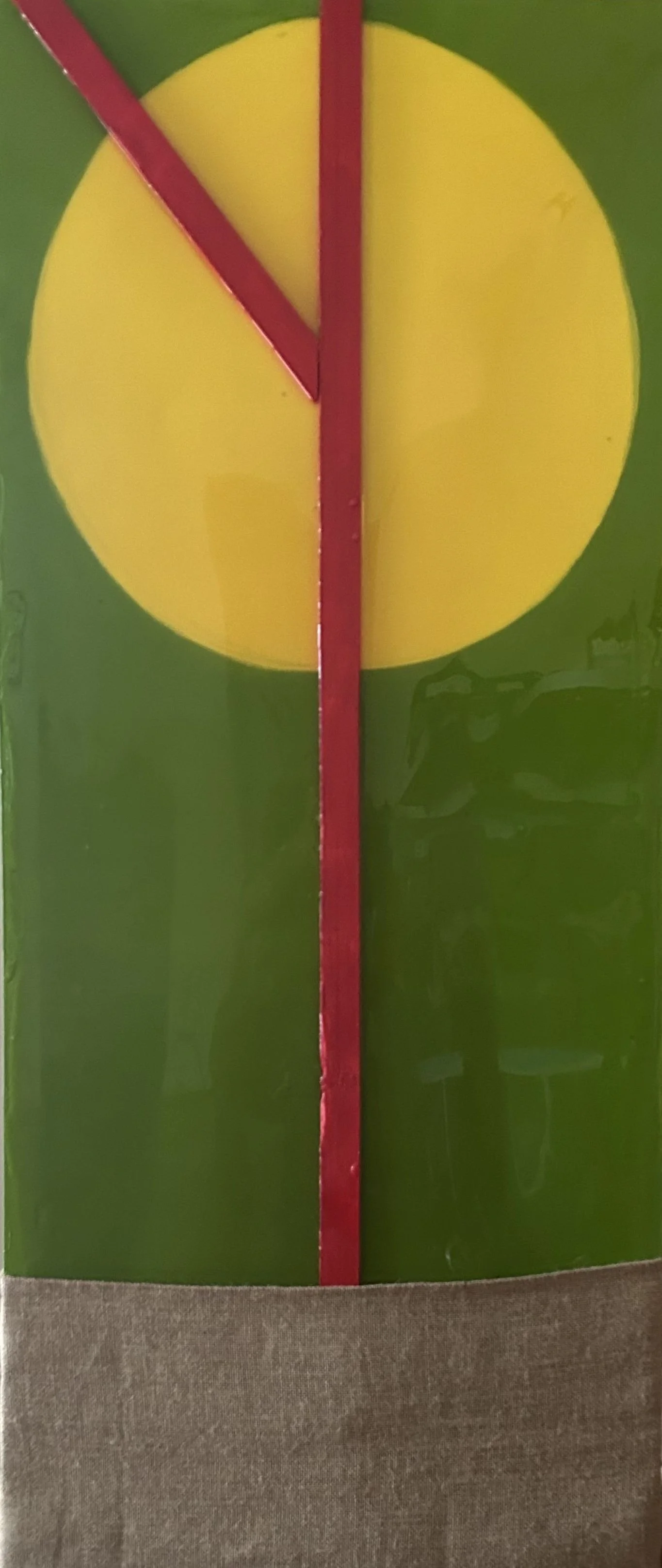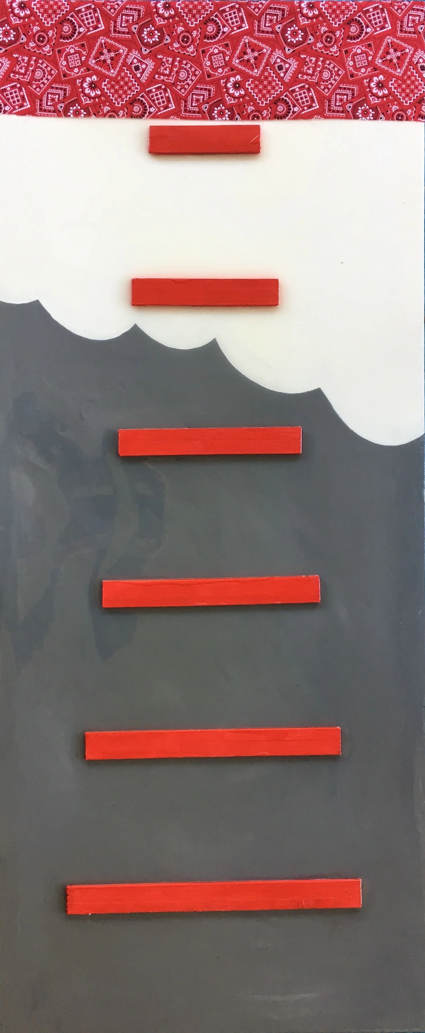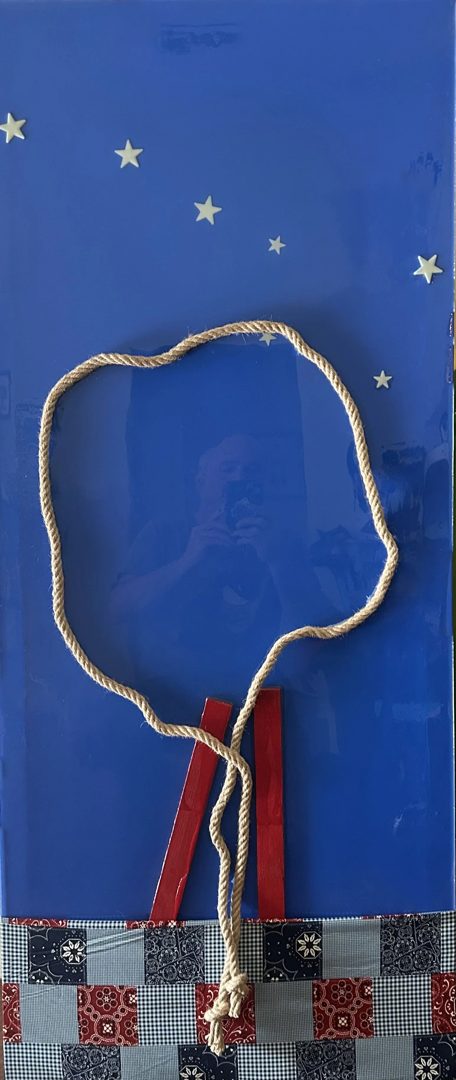 The Tale Tales series came about during a period I was reading and studying American Folklore, remembering over the stories I read as a child. I wanted to try to make images for some of them, and since this was in a very abstract period of mine, I decided to try out some rather abstracted but also recognizably representational designs. I had seen a few paintings done with the resin coating and wanted to play around with it, and went full mixed media, using the resin to bind the whole piece together. I used all manner of materials, from wood slats to cloth to burlap to balloons, rope, and glow-in-the-dark stars. I really wanted compositions that looked interesting visually, but also, if you know the name of the piece and a little about the story, would make sense in its representation.